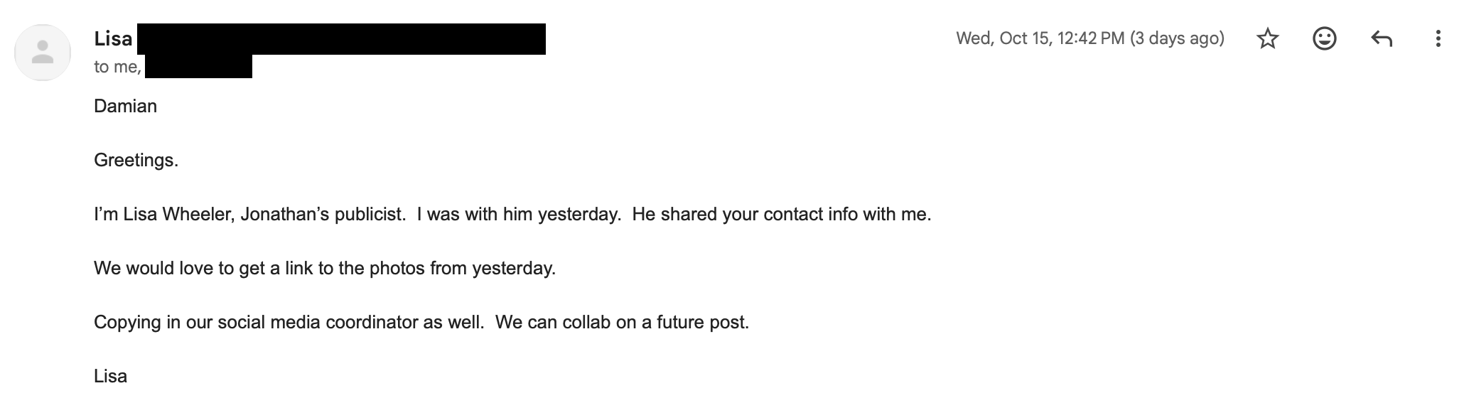 Before leaving, I gave my business cards to Jonathan and David, offering them photos from the event. And guess what? Something I never thought would happen—I received an email from Jonathan Roumie’s publicist, Lisa!